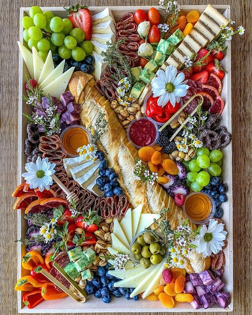 This charcuterie board offers a spectacular burst of colors and tastes.