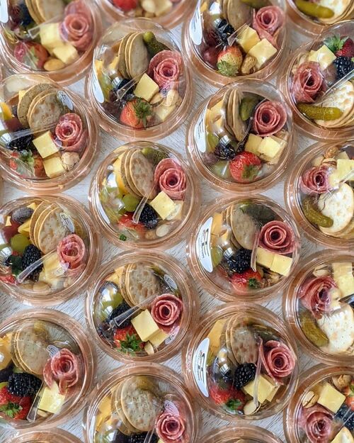 Ideal for a wedding, each container is filled with an assortment of cheeses, meats, crackers, and fresh fruits, all artfully displayed.