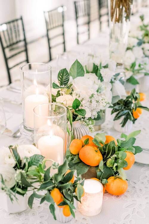 Decorations can be whimsical and flowing, offering boundless possibilities through elements like fairy lights, silk, eucalyptus, candles, or even citrus fruit.