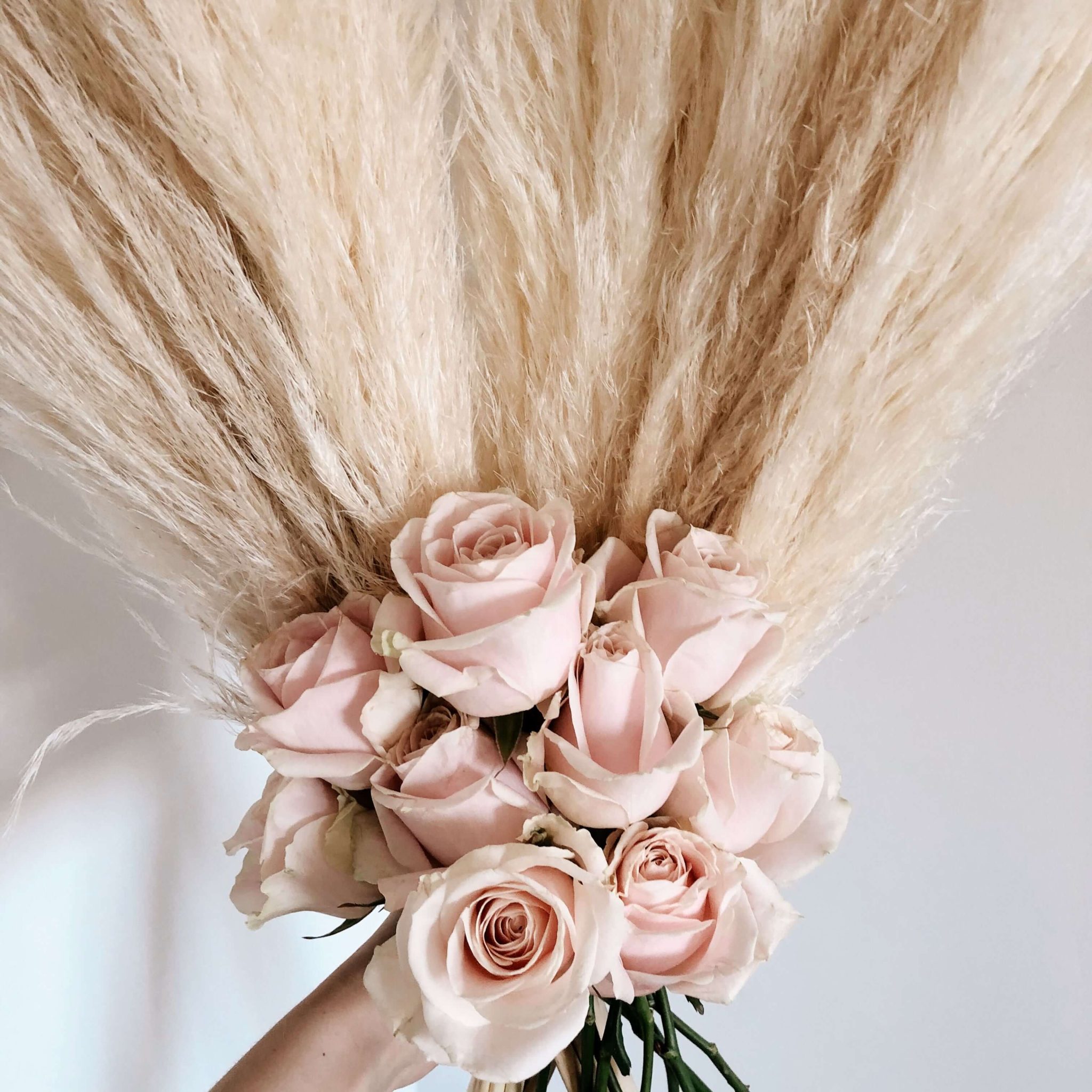 The light, airy grass elegantly complements the muted pink hues of the roses.
